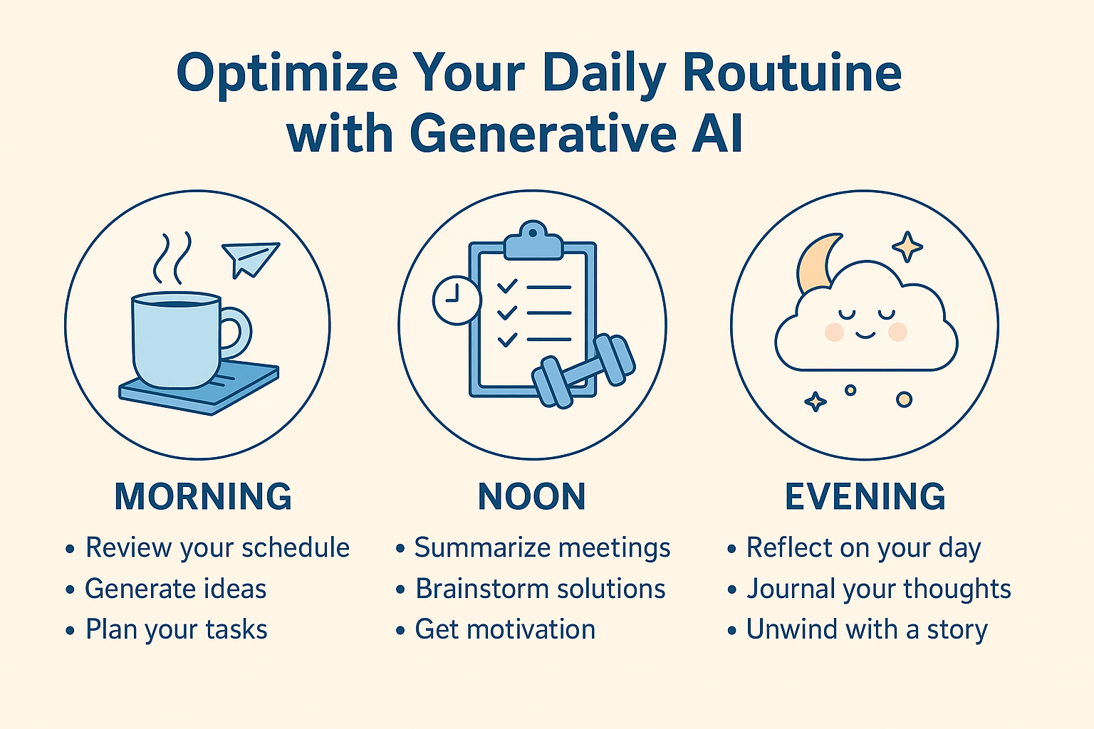 생성형 AI를 활용한 아침 루틴의 핵심은 ‘빠르고 정확한 정보 요약’입니다. GPT에게 다음과 같은 요청을 하세요: “오늘의 날씨와 일정 요약해줘. 오늘 중점적으로 신경 써야 할 일은 뭐야?” 이렇게 하면 날씨 정보, 캘린더 일정, 우선순위 업무까지 자동 정리됩니다. 또한 오늘의 목표나 마인드셋 문장(예: "오늘도 성장하는 하루를 만들자")을 함께 출력하도록 설정하면 더욱 효과적입니다.