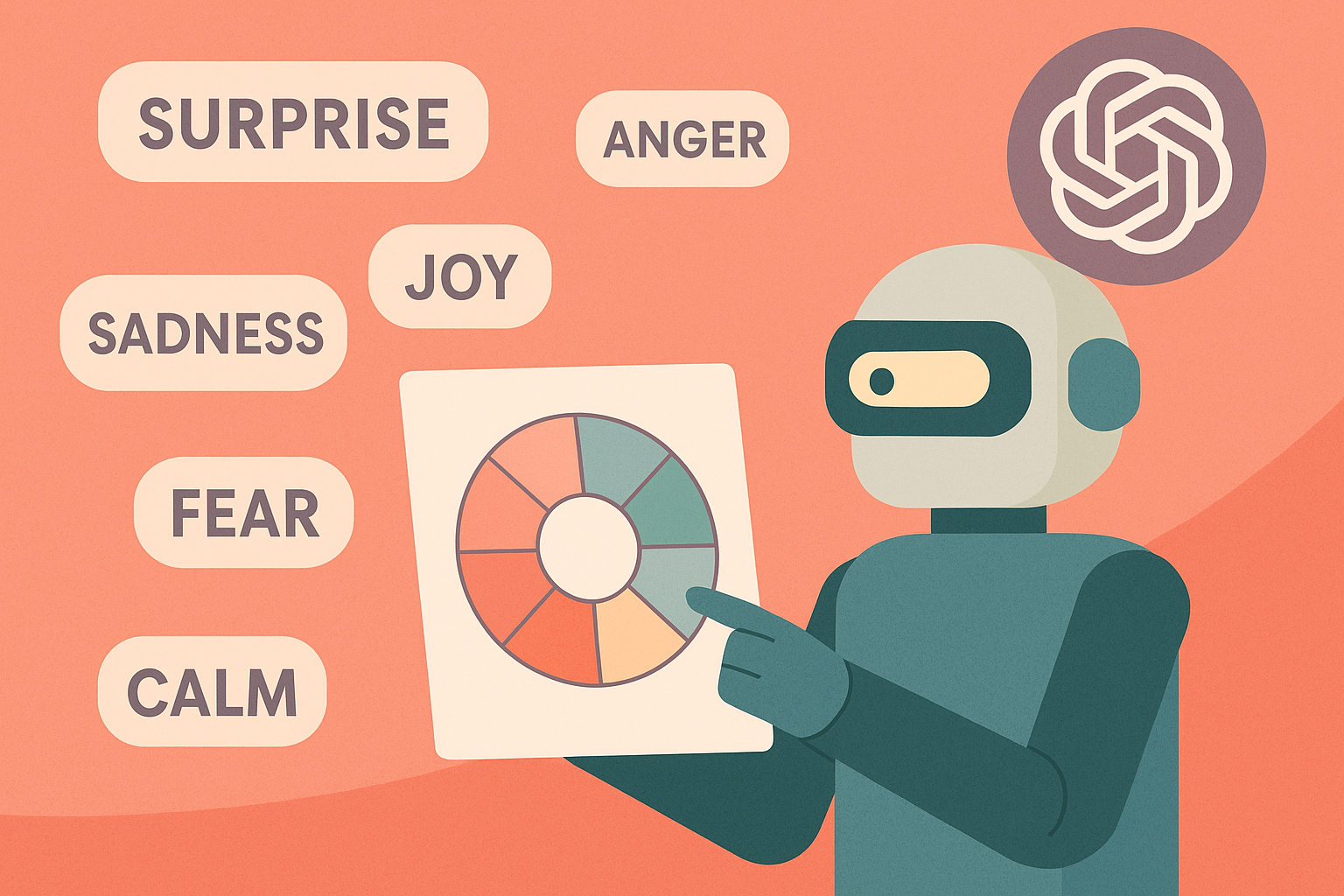 Plutchik의 감정 원은 8가지 기본 감정(기쁨, 슬픔, 분노, 공포 등)을 기반으로 다양한 감정을 배치합니다. GPT에게 다음과 같이 요청하세요: